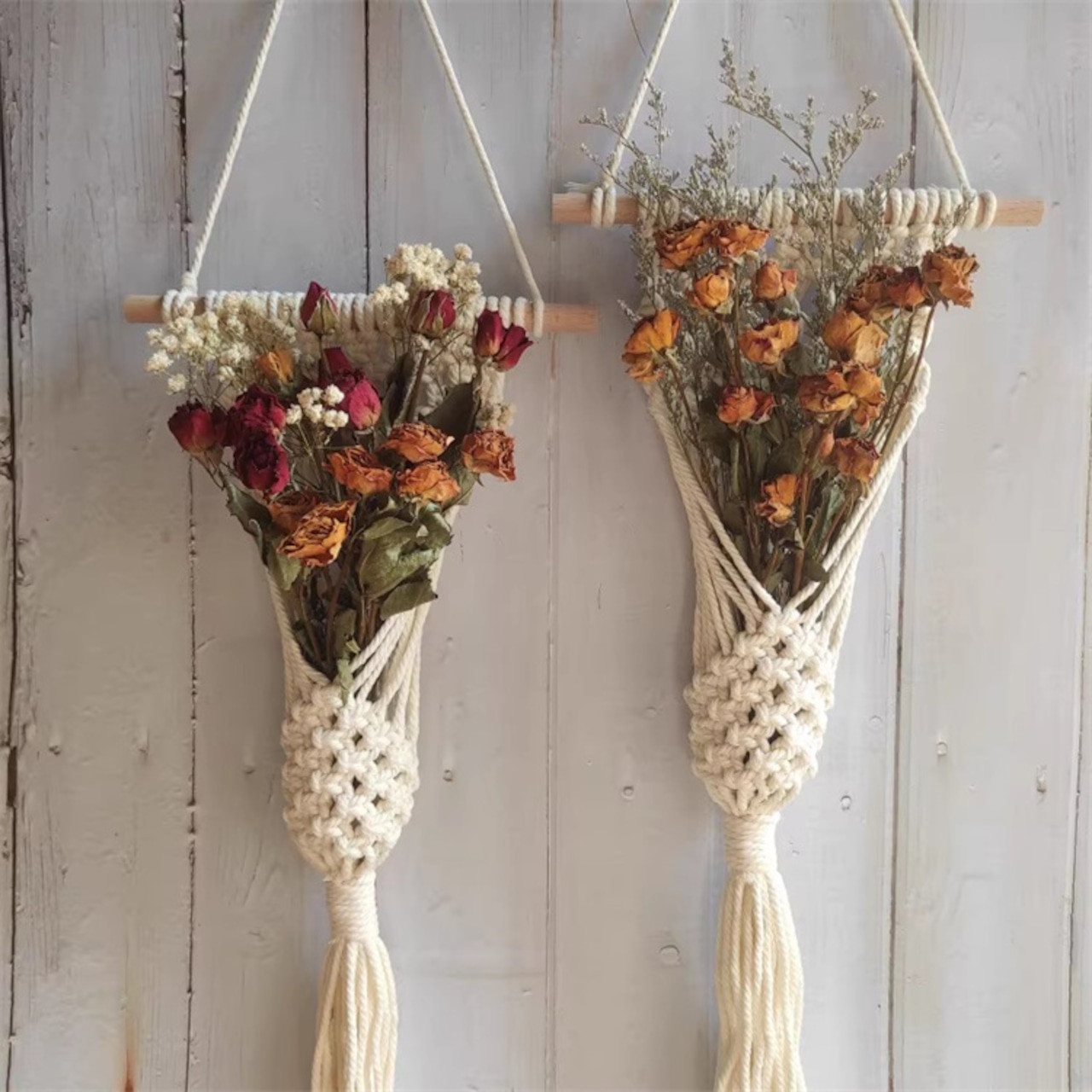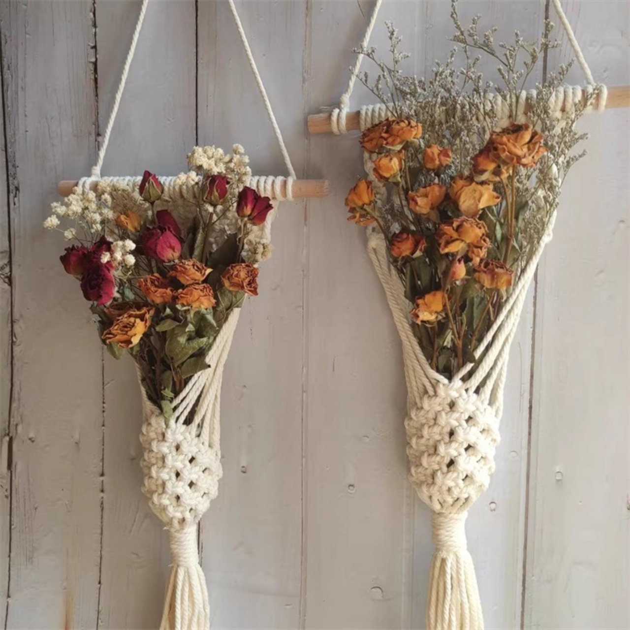 手編み壁掛けネット 北欧風リビングルーム用 ドライフラワー付き 壁飾り 民宿・インテリア装飾
