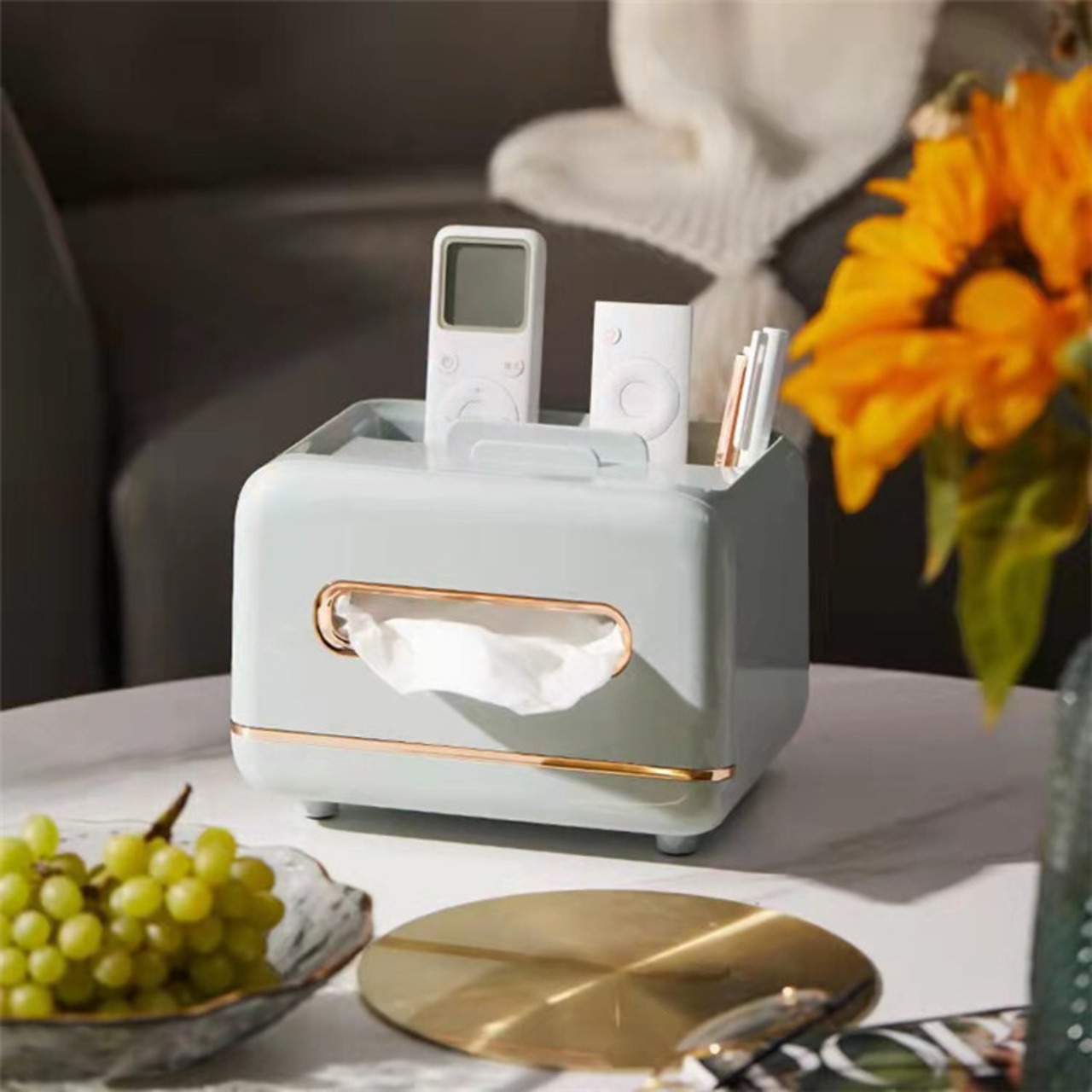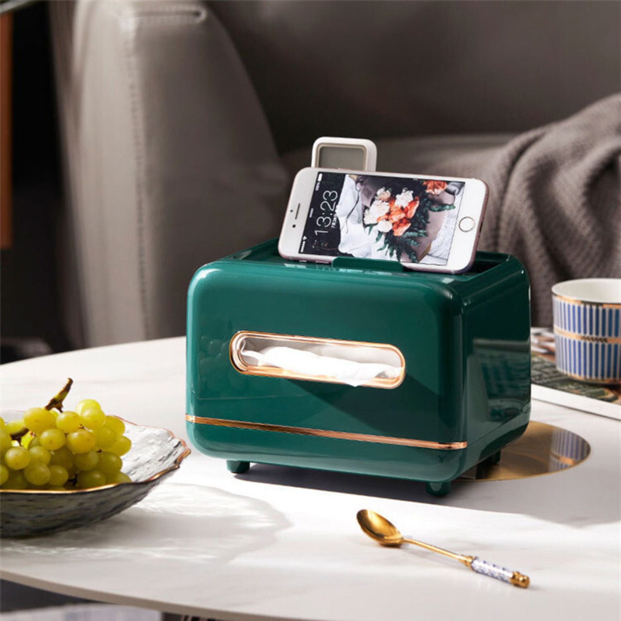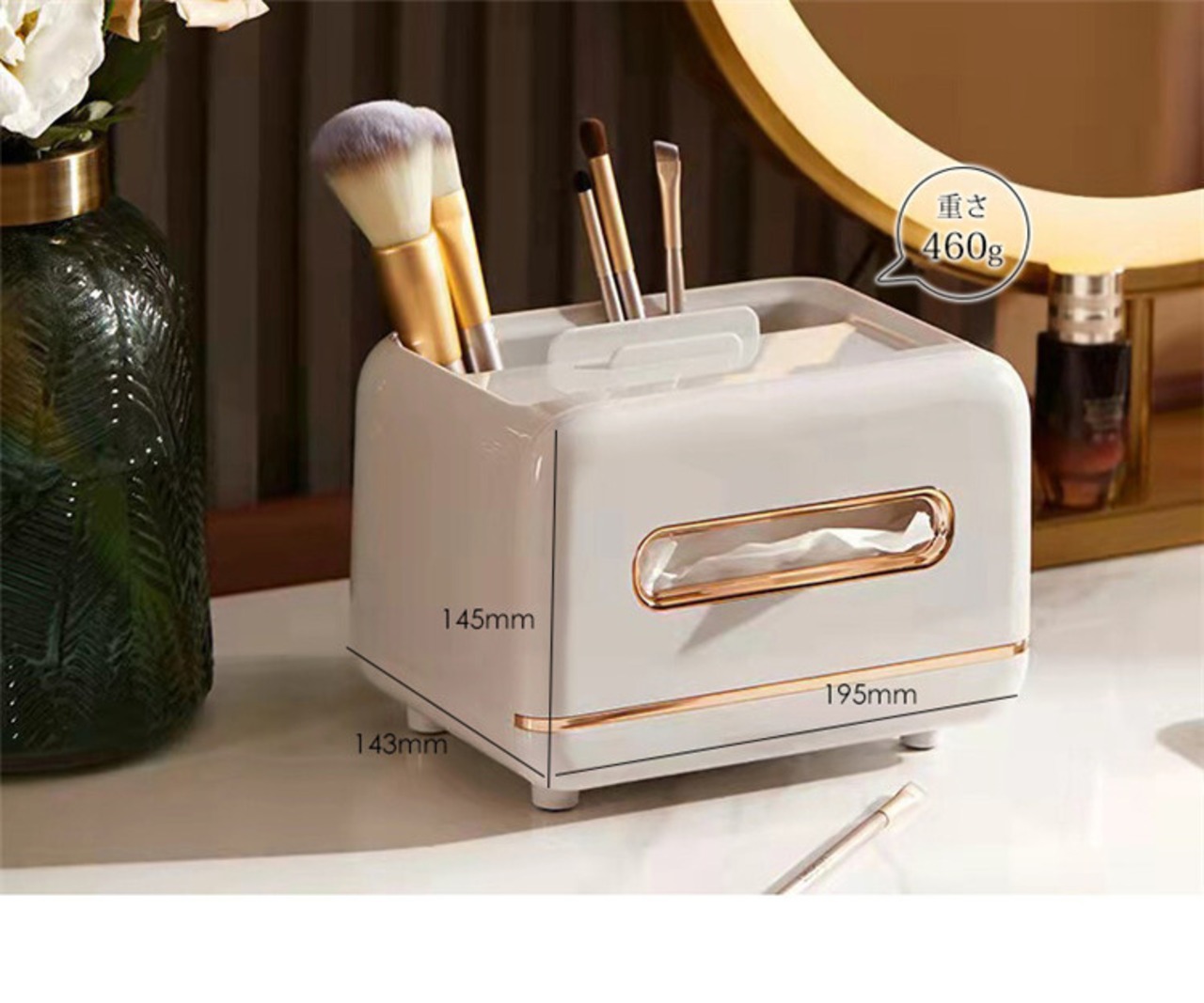 ティッシュケースだけでなく、小物入れやリモコンラックとしても活躍。さらに、スマホスタンドとしても機能するため、デスクやリビングで便利にお使いいただけます。