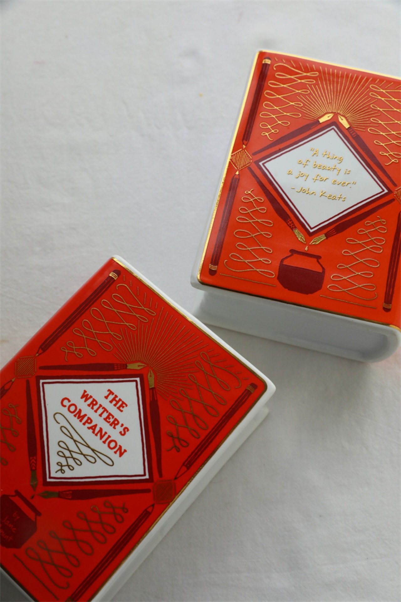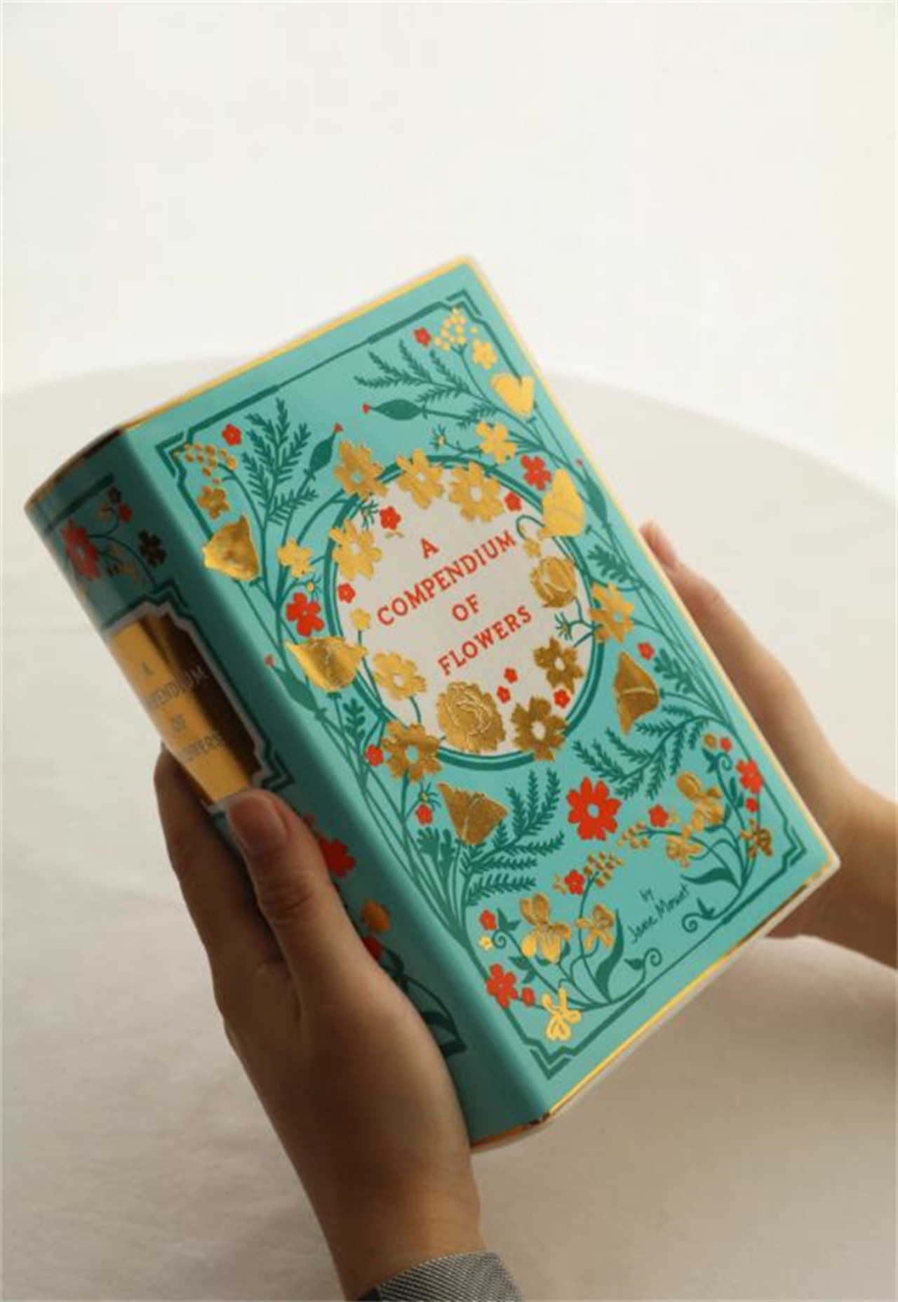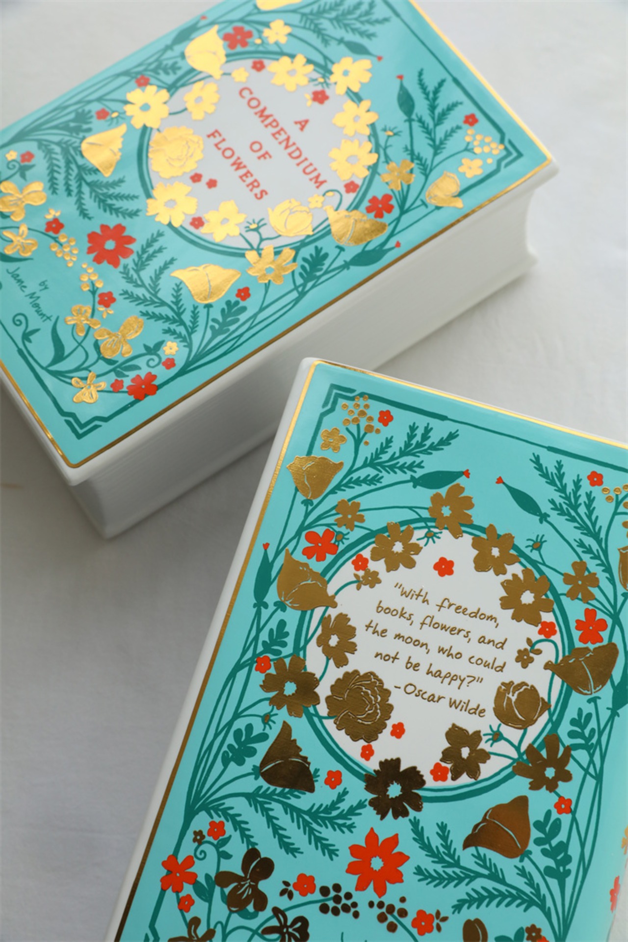 この「絵本テーマの両面デザイン陶器花瓶」は、繊細な金箔加工が施された本の形が上品な雰囲気を演出。